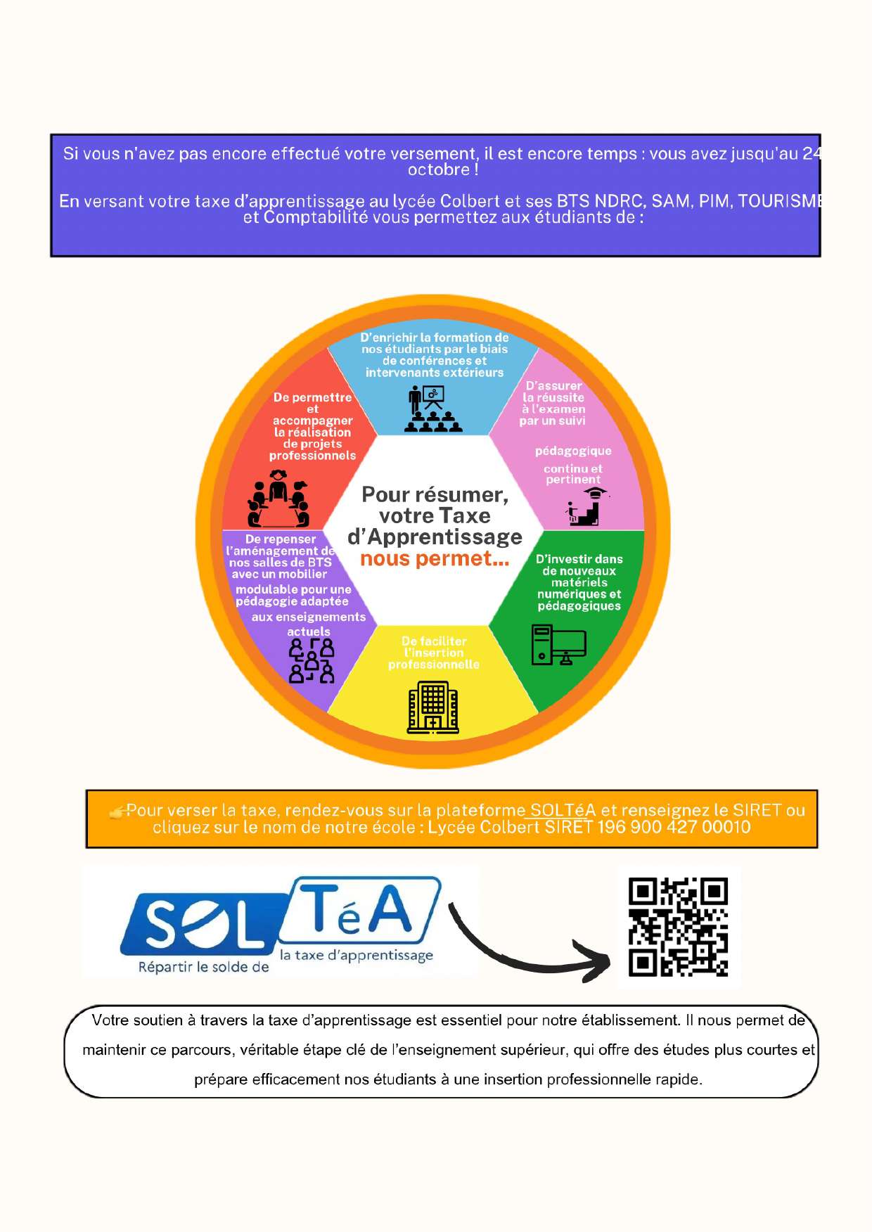 Connectez vous à la plateforme SOLTéA pour affecter tout ou partie du solde de votre taxe d’apprentissage à notre établissement jusqu’au 24 octobre en renseignant le numéro de SIRET DU LYCEE COLBERT : 196 900 427 00010.