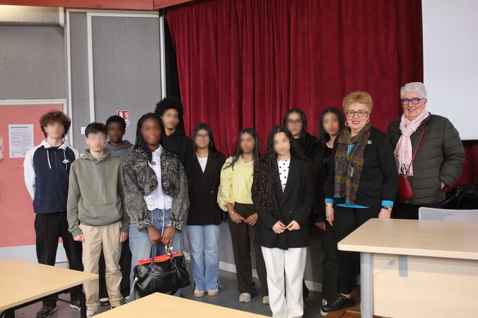 Dans le cadre de leur projet sur le Convoi 77, les élèves de Première ont pu entendre Évelyne Haguenaueur, venue témoigner des trajectoires familiales durant la Seconde Guerre mondiale, et de l'expérience concentrationnaire de ses grands-parents et de son père, déportés à Auschwitz. Un témoignage solennel, et émouvant, de la part d'une femme pour qui le devoir de mémoire est essentiel.